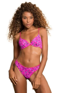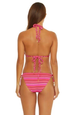 Alexia bikini top features a shiny stretch satin with strappy interlinked details to create a basketweave effect. Offers removable cups, adjustable straps and a hook back closure.