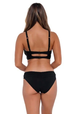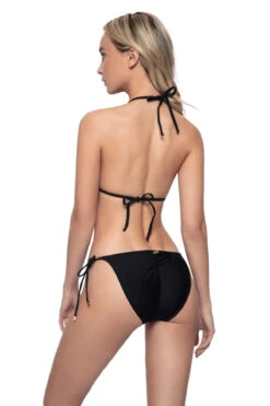 Bralette bikini top features keyhole detail at front with adjustable tie, allows for adjustable front coverage. Offers a personalized fit with removable soft cups, adjustable back straps and double hook back closure. Power mesh provides additional lift and support.