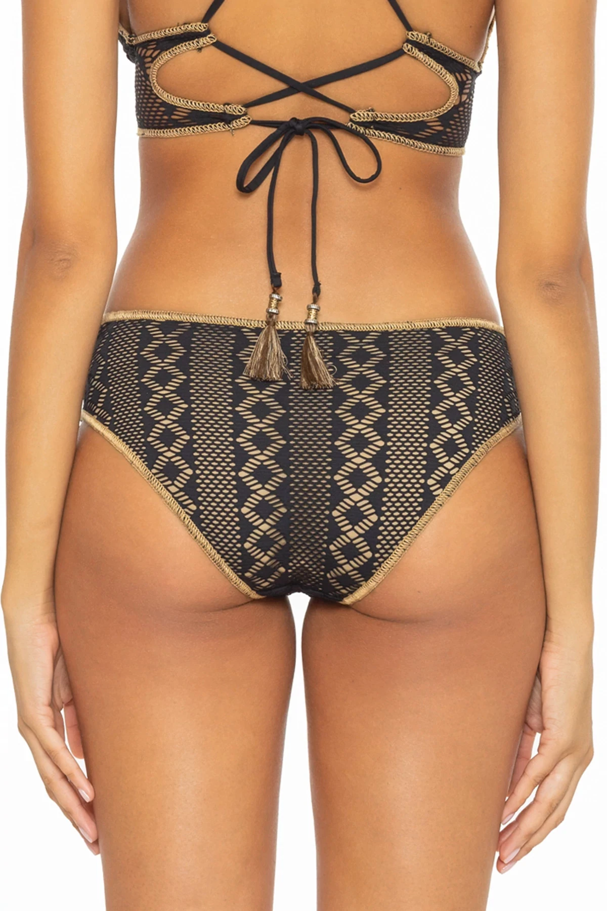 Hipster bikini bottom features a nude contrast lining, edge stitching, tie sides with decorative beaded tassels. Offers moderate coverage.
