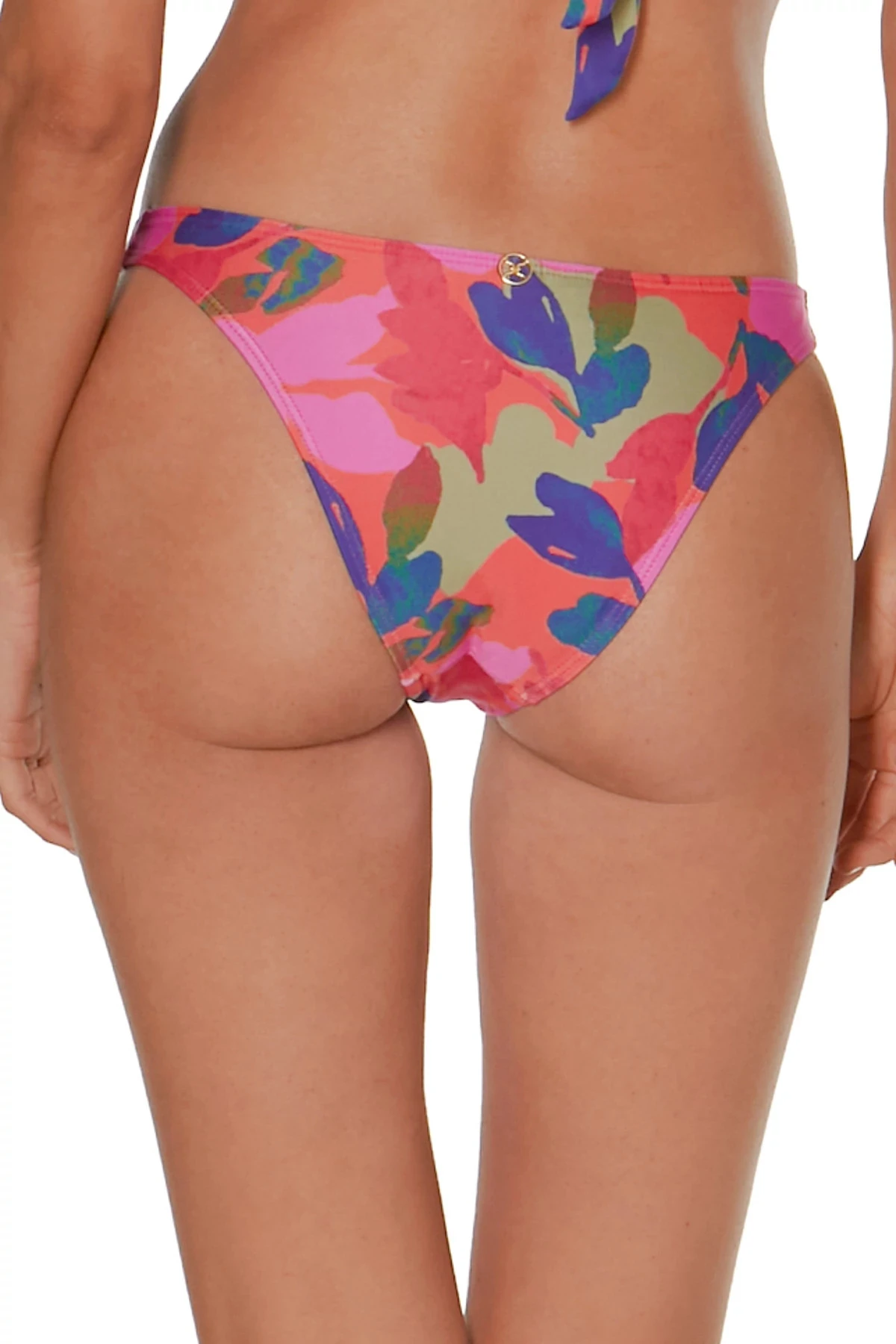 Fany brazilian bikini bottom features a vibrant abstract foliage print and offers minimal coverage.