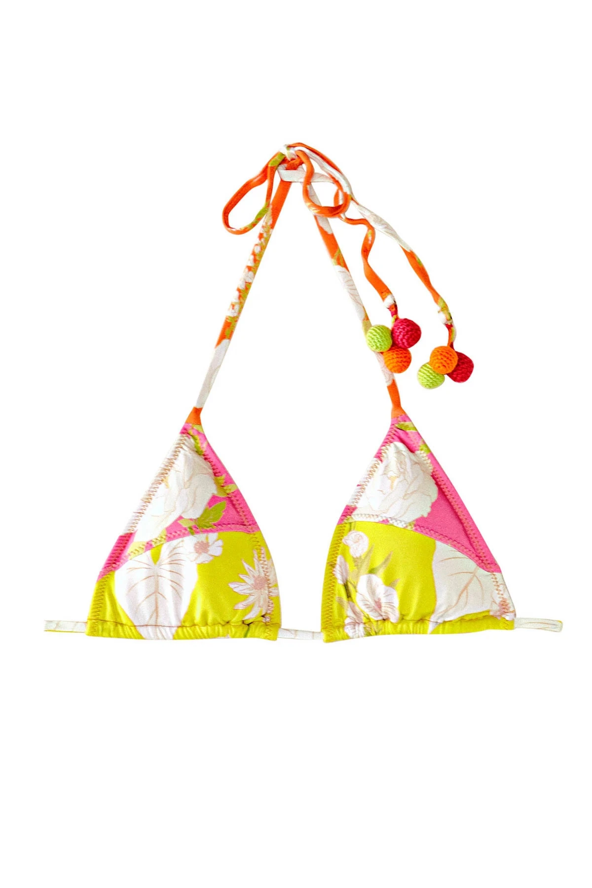 Neon garden triangle bikini top features a bright satin fabrication with a floral print and offers adjustable sliding cups and pom pom back ties.