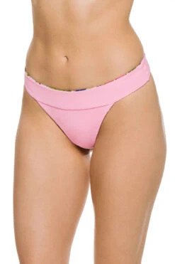 Hipster bikini bottom features a bright stripe pattern and metallic rib-knit finish with adjustable tab sliders at hips. Offers moderate coverage.