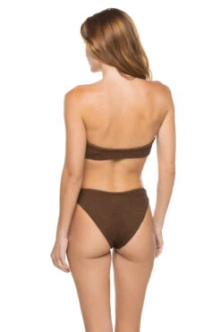 Nicole bikini set features a bandeau top with a center glitter heart ring detail paired with an adjustable hipster bottom that can be worn high or low rise with the same glitter heart rings at hips.