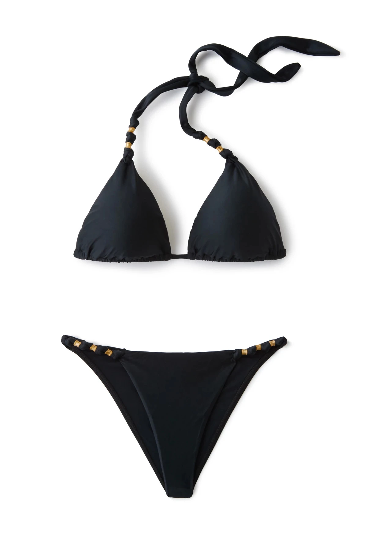 Paula hipster bikini bottom features unique beading and knot detailing at the hips and offers moderate coverage.