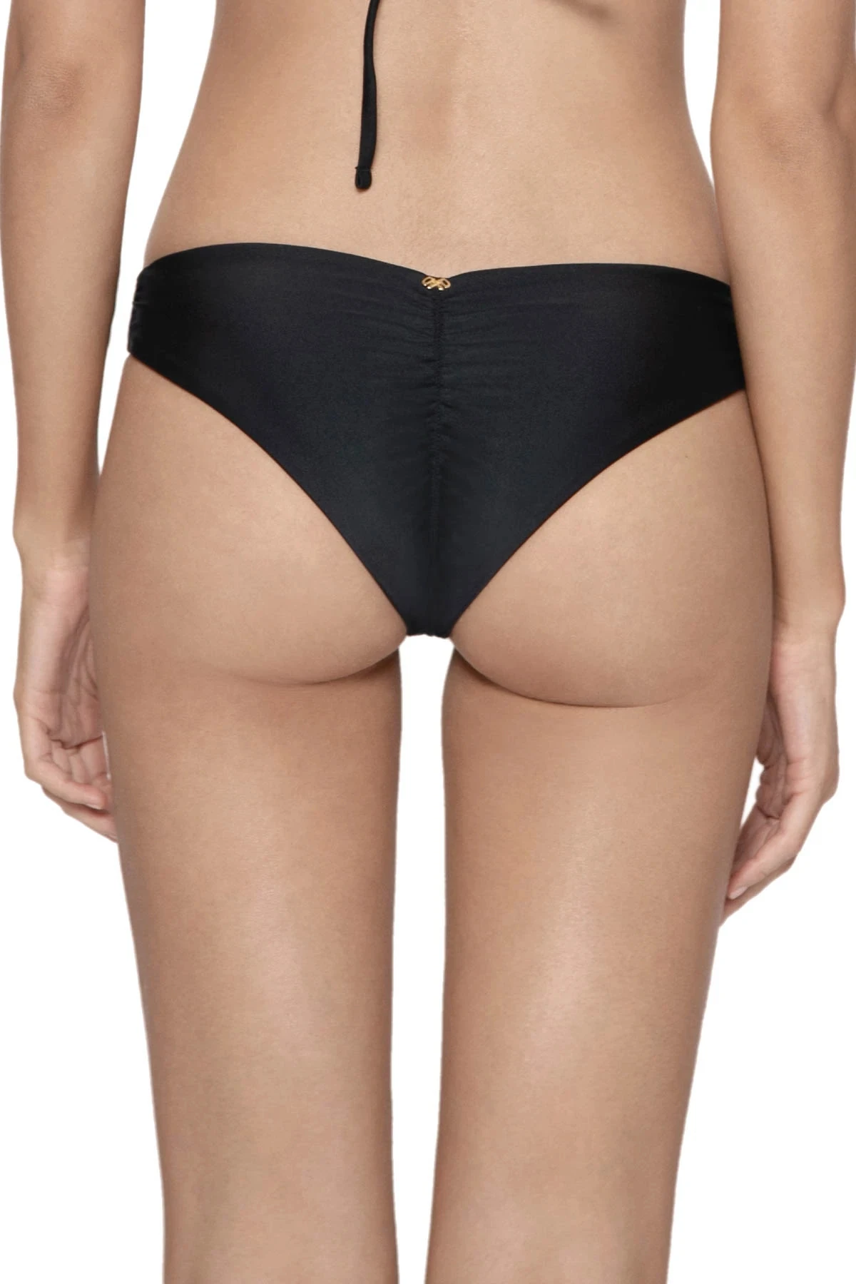 Brazilian bikini bottom features a ruched back and offers minimal coverage.