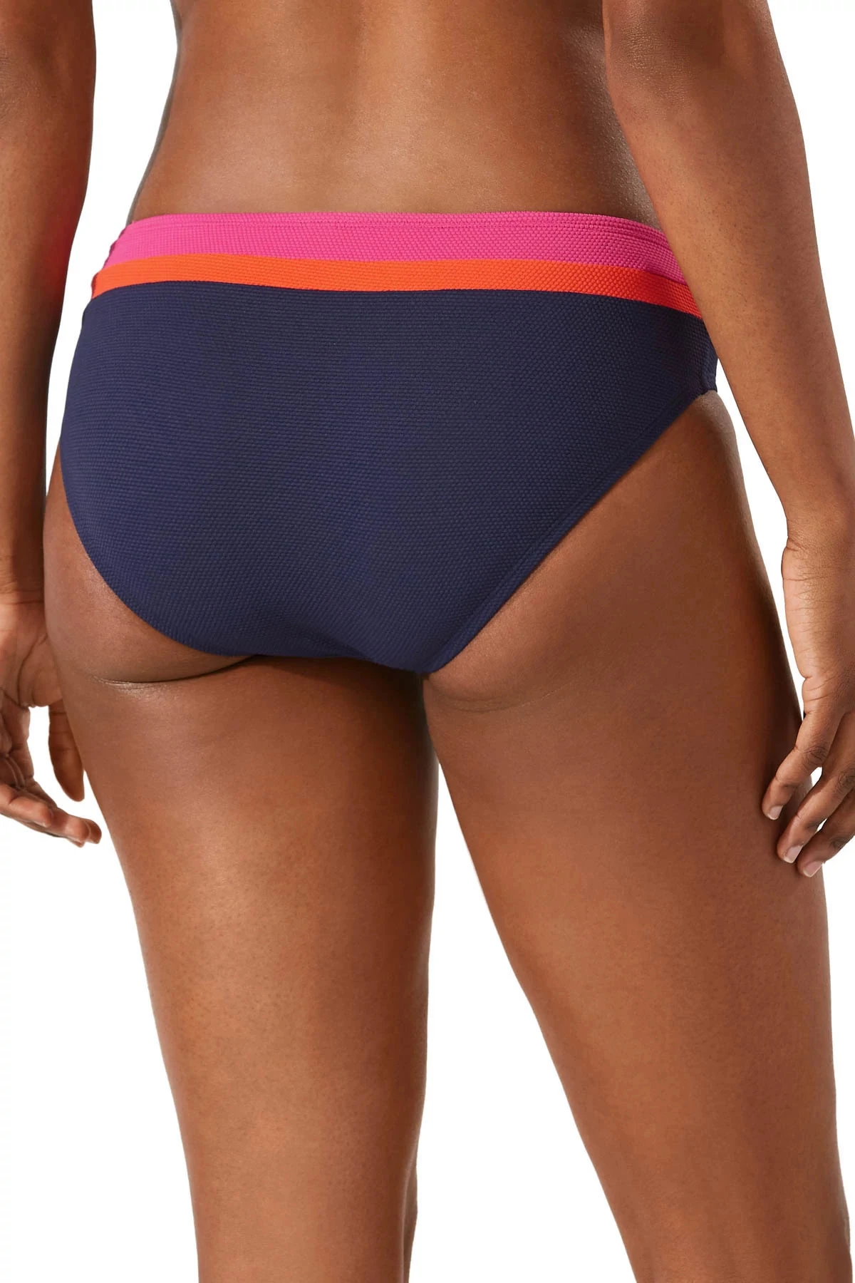 Hipster bikini bottom features a color block texture and offers moderate coverage.