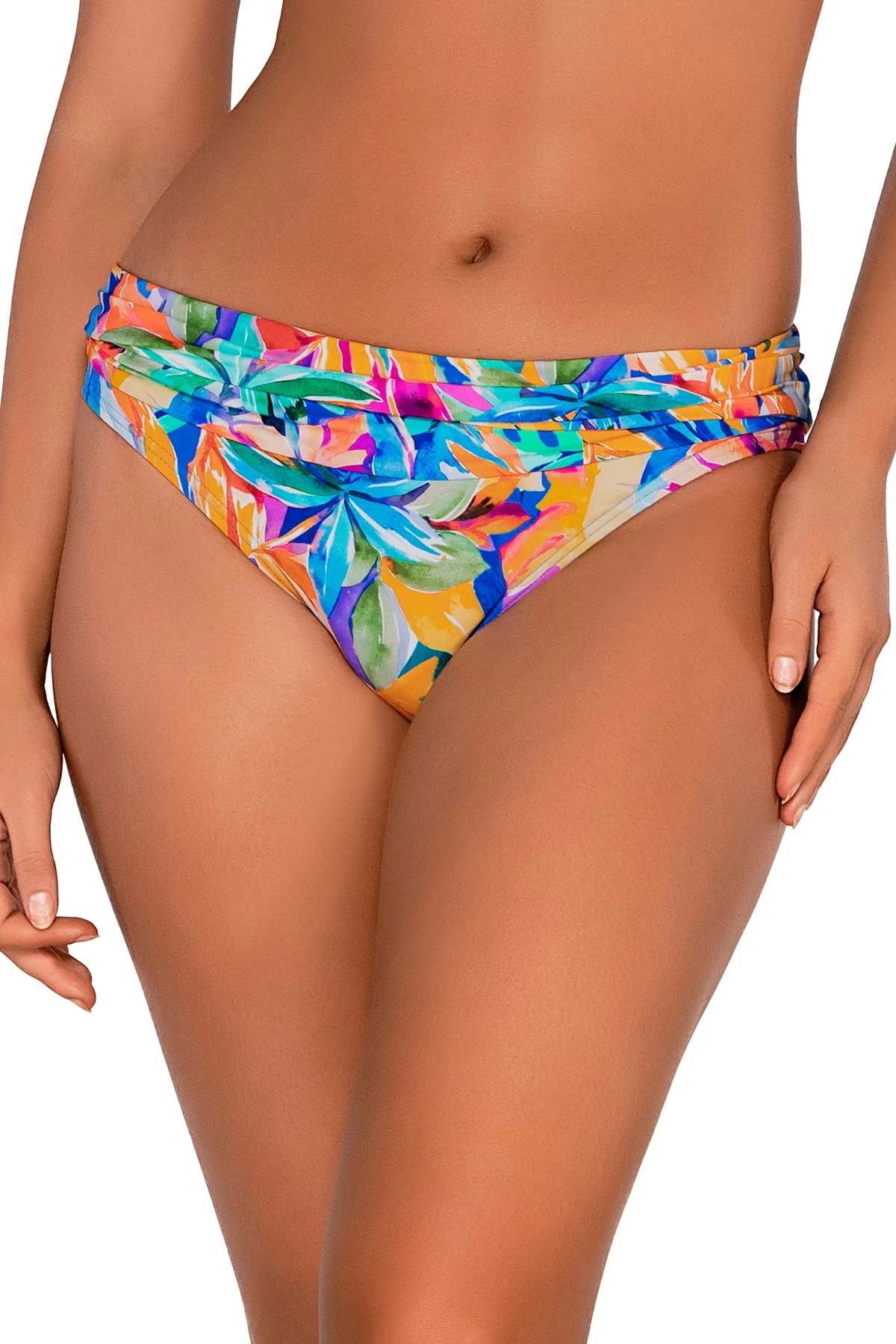Add a little flair to your summer wardrobe in this unforgettable bottom. Features include shirred band with cinched back detail and matching front and back colored lining. Sits straight across the hip.
