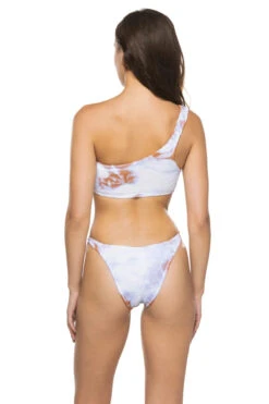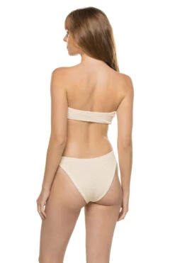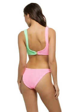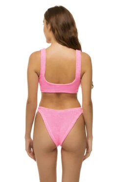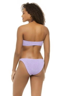 Xandra two piece bikini set features scrunchie seersucker fabrication with pullover scoop neck bikini top and hipster bikini bottom. One size fits sizes 4 to 12.